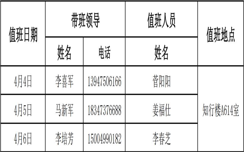 1.值班地点:学院资料室(知行楼A614室),值班电话:8313474。