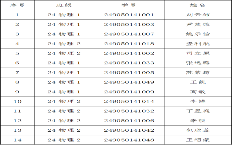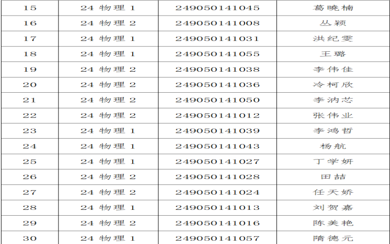 根据《内蒙古民族大学卓越人才创新实验班管理办法》校发〔2024〕46号文件和物理与电子信息学院卓越创新实验班(物理)人才培养计划实施细则要求,经学生个人申报、通过笔试、面试考核后,拟推荐以下30名学生进入2024级拔尖人才(物理学)实验班学习,现予以公示。