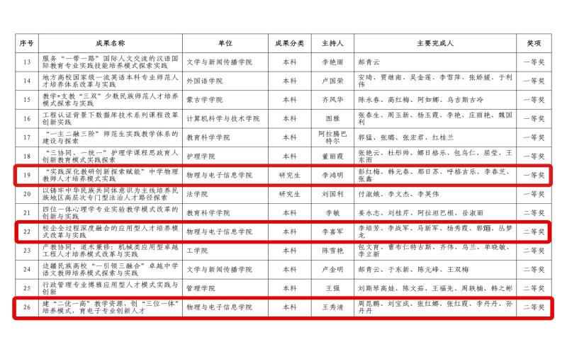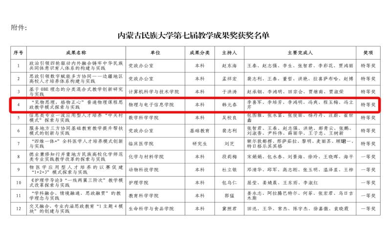9月3日,学校发布《内蒙古民族大学第七届教学成果奖评选结果的通知》。我院韩元春老师荣获特等奖,李鸿明老师荣获一等奖,李喜军老师、王秀清老师荣获二等奖。