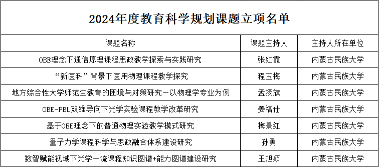 按照《内蒙古自治区教育科学规划课题管理办法》的有关规定,经专家评审,自治区教育科学规划领导小组审批,我校有64项获批2024年度自治区教育科学规划课题。其中我院获批7项课题。