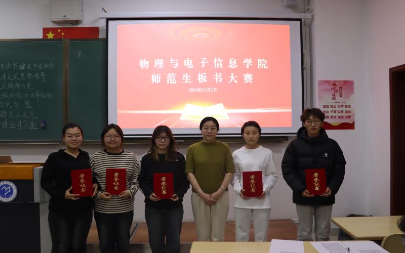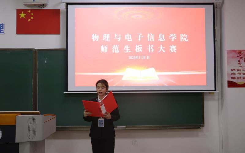 为全面贯彻落实习近平总书记关于做好推广普及国家通用语言文字工作的重要指示精神,提升我院师范生板书书写及设计水平,11月1日晚,物理与电子信息学院举办师范生板书比赛,共有21名同学参加比赛。科尔沁第三中学书法教师、科尔沁区书法协会会员李淼,学院党委副书记马新军教授,学院分工会主席韩元春教授以及学院香莲教授担任评委。比赛由学院团总支干事冯欣怡主持。