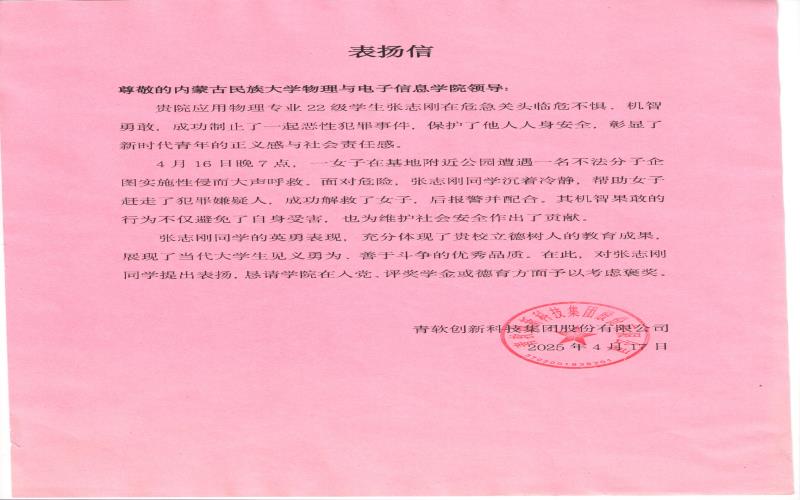 近日,青软创新科技集团股份有限公司向我院发了一封表扬信,表扬我院2022级应用物理学专业学生张志刚同学在危急关头临危不惧、机智勇敢,成功制止了一起恶性犯罪事件,保护了他人人身安全。表扬信内容具体如下: