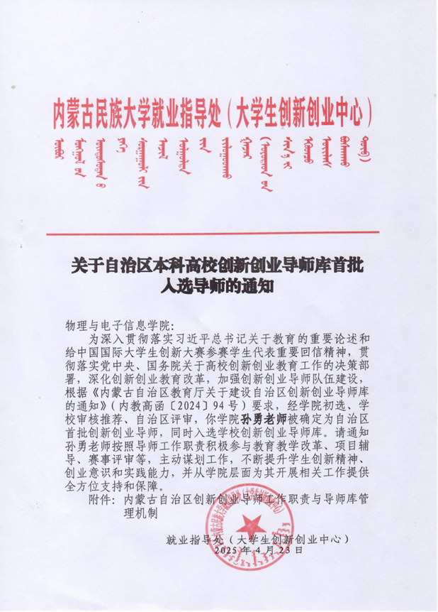 本次入选是根据《内蒙古自治区教育厅关于建设自治区创新创业导师库的通知》(内教高函([2024094号)要求,经学院初选、学校审核推荐、自治区评审决定。是孙勇老师在创新创业教育领域卓越成就的有力见证,也是学校和学院长期重视创新创业教育工作的成果体现。