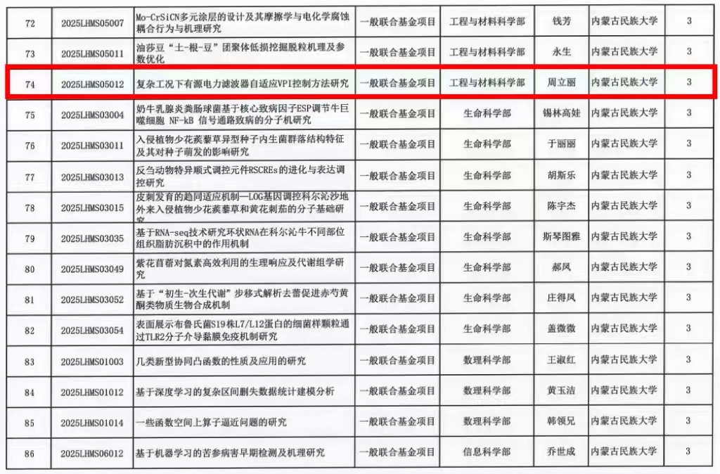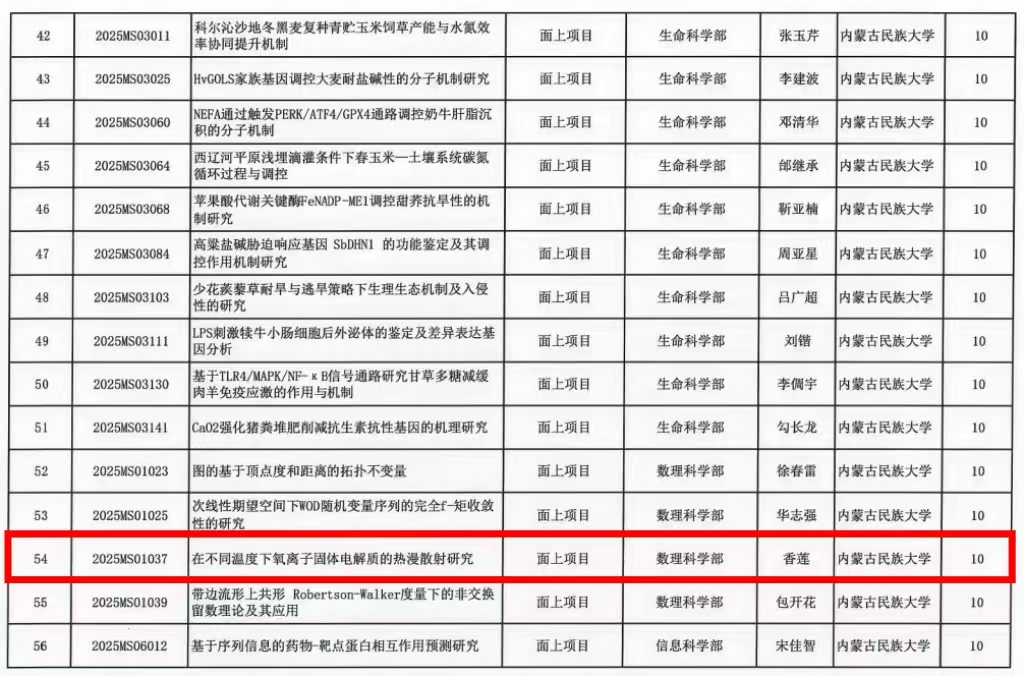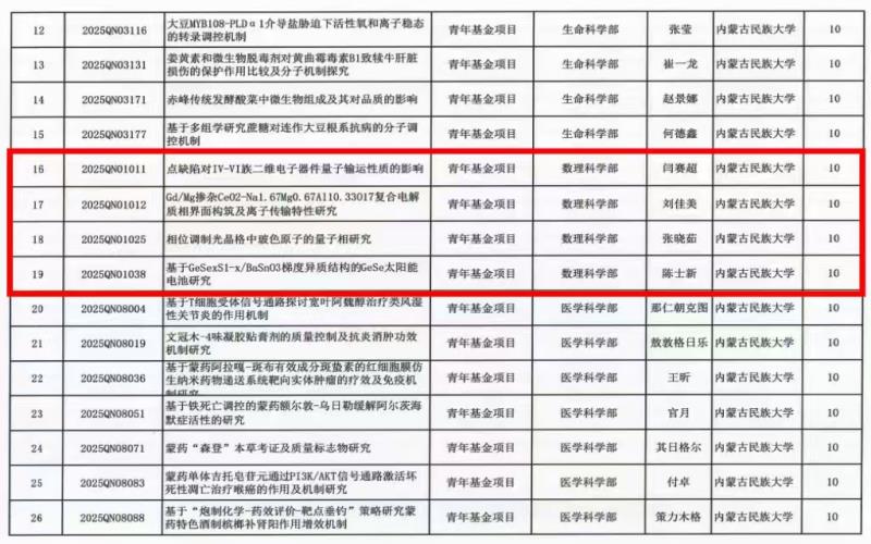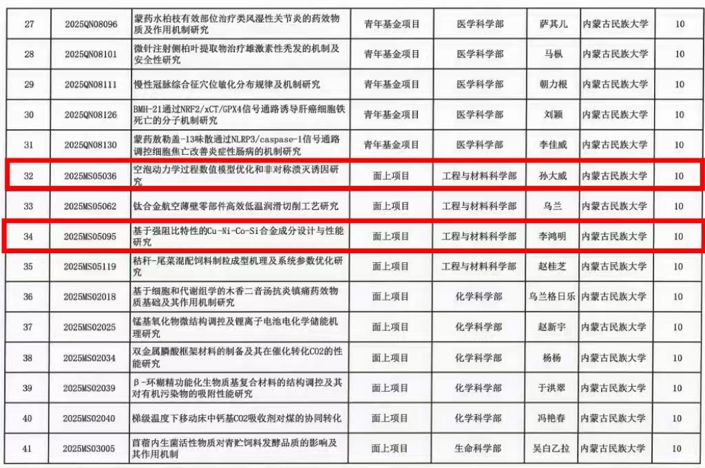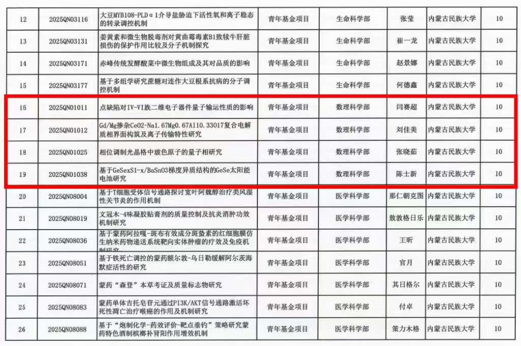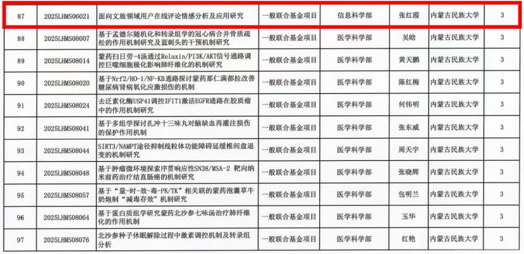 近日,自治区科技厅公布了2025年度内蒙古自治区自然科学基金资助项目,我校获准内蒙古自治区自然科学基金项目经费973万元,获批项目97项。其中,我院9位教师获批自治区自然科学基金资助项目,项目经费76万元。