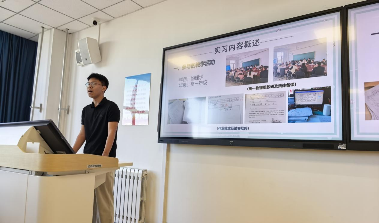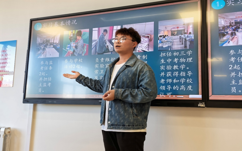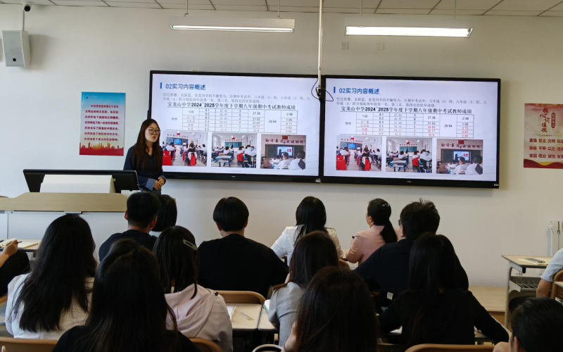 会上,12个实习基地的实习小组代表和3位支教学生以生动详实的汇报,全方位展现了实习历程中的成长与感悟。他们从实习基地的办学特色、师资力量等基本情况切入,深入阐述了课堂教学、班级管理、教研活动等实习内容;不仅坦诚分享了初登讲台时的紧张、教学实践中的困惑等问题与挑战,还通过具体案例生动呈现了应对策略;更着重讲述了在教学设计、师生沟通、应急处理等方面取得的显著进步,以及收获的职业认同感与教育情怀。