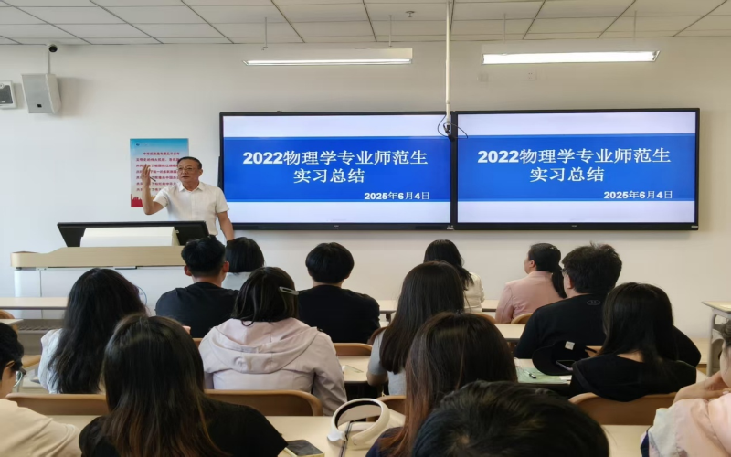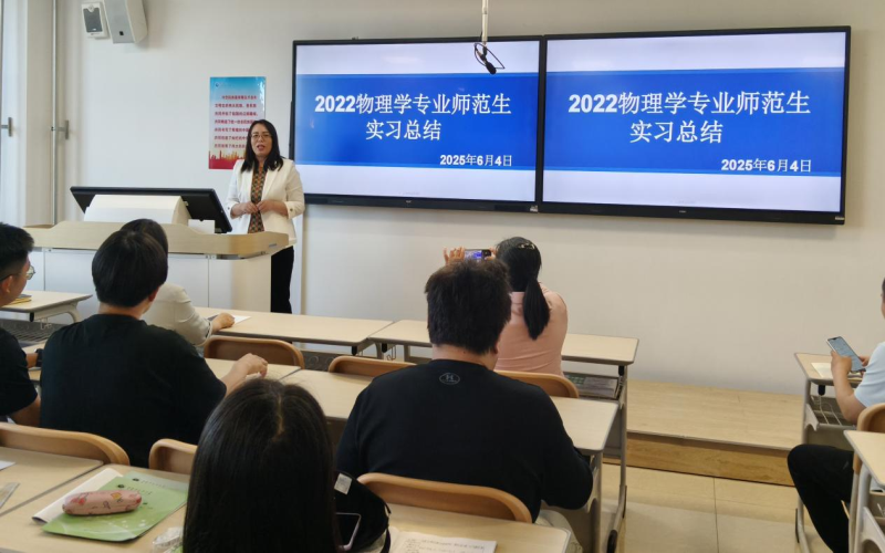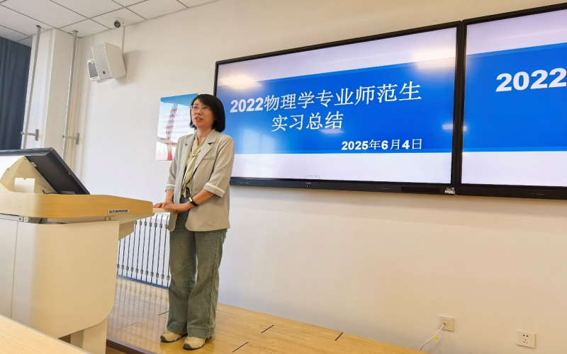 物理教育教研室主任冯立芹首先总结了2022级教育实习总体情况。她指出,本次实习以“深化理论应用、锤炼教学能力、夯实职业素养”为目标,于3月3日至5月26日期间在12个实习基地有序开展。在学院领导统筹部署、实习基地全力配合、指导教师悉心引领、全体实习生共同努力下,圆满完成授课、班级管理、教研实践等多项实习任务。