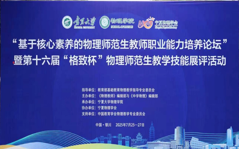 “格致赛场竞风流,青衿学子显真章”!7月25日至27日,由中国教育学会物理教学专业指导委员会会刊单位《中学物理》编辑部与《物理教师》编辑部联合主办,宁夏大学承办,教育部基础教育物理教学指导专业委员会指导的第十六届“格致杯”全国物理师范生教学技能展评活动在宁夏银川举行。