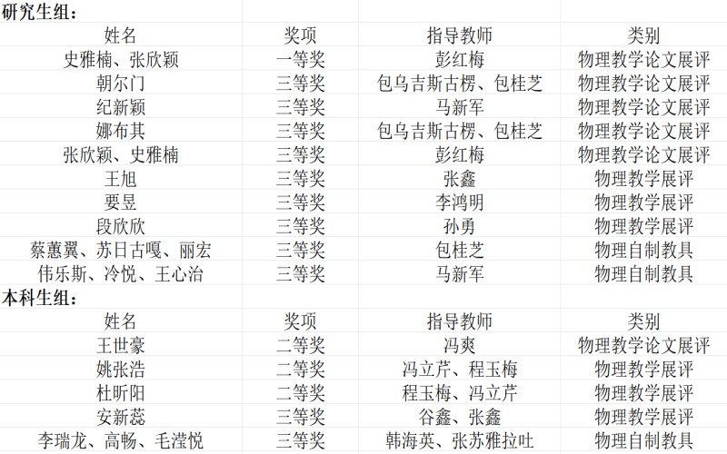 来自北京师范大学、华东师范大学、陕西师范大学、华中师范大学、内蒙古民族大学等全国117所高校的1400余名选手团队展开激烈的角逐。本次赛程分为教学技能展评,创新实验设计与自制教具展评,物理教育教学优秀论文展评"三个赛道。在本次教学活动中,我院选派3名本科生,3名研究生参加物理课堂教学技能展评,1名本科生,5名研究生参加物理教学论文展评,选派1组本科生,2组研究生参加创新实验设计与自制教具展评,经过激烈角逐,获得一等奖1项,二等奖3项、三等奖11项。