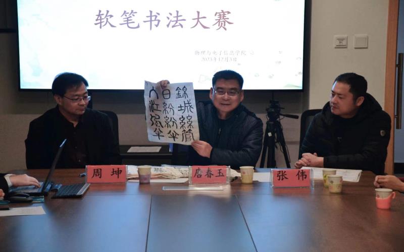 12月3日,学院在知行楼A618会议室举办师范生“执笔书经典 古韵逸书香”书法比赛,共有28名同学参加比赛。内蒙古民族大学唐春玉教授、周坤副教授、通辽市书法协会张伟副秘书长担任评委,物理与电子信息学院院长李培芳老师、学院分工会主席韩元春老师出席比赛。