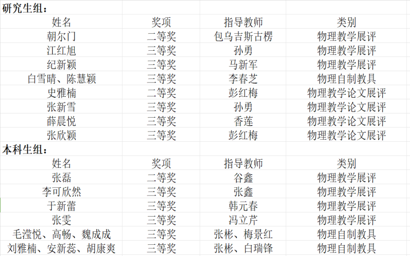 本次赛程分为教学技能展评,创新实验设计与自制教具展评,物理教育教学优秀论文展评"三个赛道。我校参赛选手发扬蒙古马精神特质,夯实的专业技能,较强的创新能力赛出了风格和水平,实现了物理学师范专业此赛事零的突破。在本次教学活动中,我院选派4名本科生,3名研究生参加物理课堂教学技能展评,5名研究生参加物理教学论文展评,选派2组本科生,1组研究生参加创新实验设计与自制教具展评,经过激烈角逐,获得二等奖3项、三等奖11项。