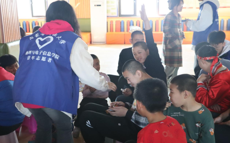 为积极弘扬新时代雷锋精神,关心关爱特殊儿童群体健康成长,3月17日,物理与电子信息学院40名青年志愿者赴通辽市丑小鸭特殊教育学校组织开展“点亮星空,与爱同行”志愿服务活动。活动由校学生会主席团成员吴铮、学院青年志愿者协会组织部负责人胡康爽带队,通辽市丑小鸭特殊教育学校校长周广红参加活动。志愿者王德莉、秦源主持活动。