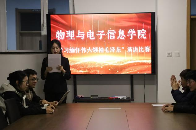 为深入学习缅怀伟大领袖毛泽东同志的丰功伟绩和崇高精神,传承红色基因,弘扬革命精神,10月27日,物理与电子信息学院举办了“学习缅怀伟大领袖毛泽东”主题演讲比赛。内蒙古民族大学图书馆讲解员李基冉、物理与电子信息学院学生会执行主席尹佳琪、物理与电子信息学院青年志愿者协会会长高嵩林进行指导。比赛由学院学生分会文艺部王艺潼主持。