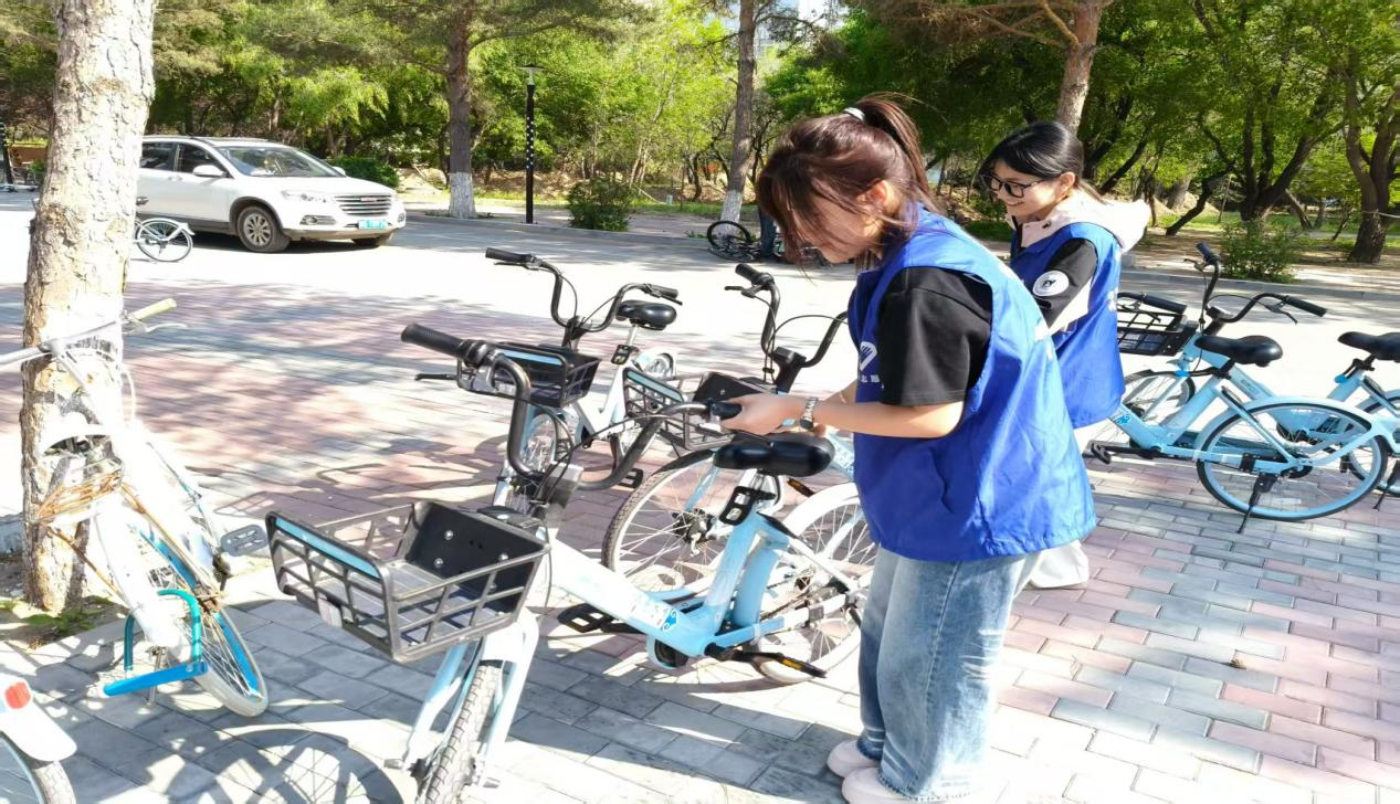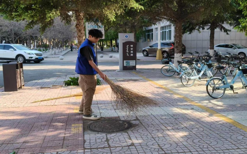 活动中,同学们在工作人员带领下分组领取工具,迅速前往指定区域清扫。在明安图楼前,志愿者们手持扫帚,认真清理碎石、落叶和纸屑杂物;自行车停放区里,大家合力扶正车辆,按标识线排列整齐。阳光下,同学们忙碌有序,欢声笑语与劳动声响交织,为校园增添温暖。